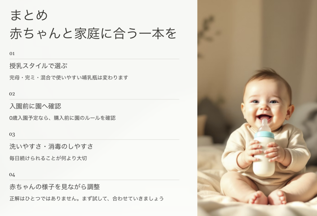 だからこそ、哺乳瓶選びは「人気だから」で決めるより、これからの生活に合うかどうかで考えるのがいちばん失敗しにくいです。
