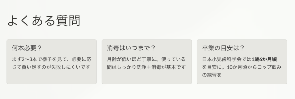 - 哺乳瓶の卒業は、コップ飲みの練習も見据えて少しずつ進める