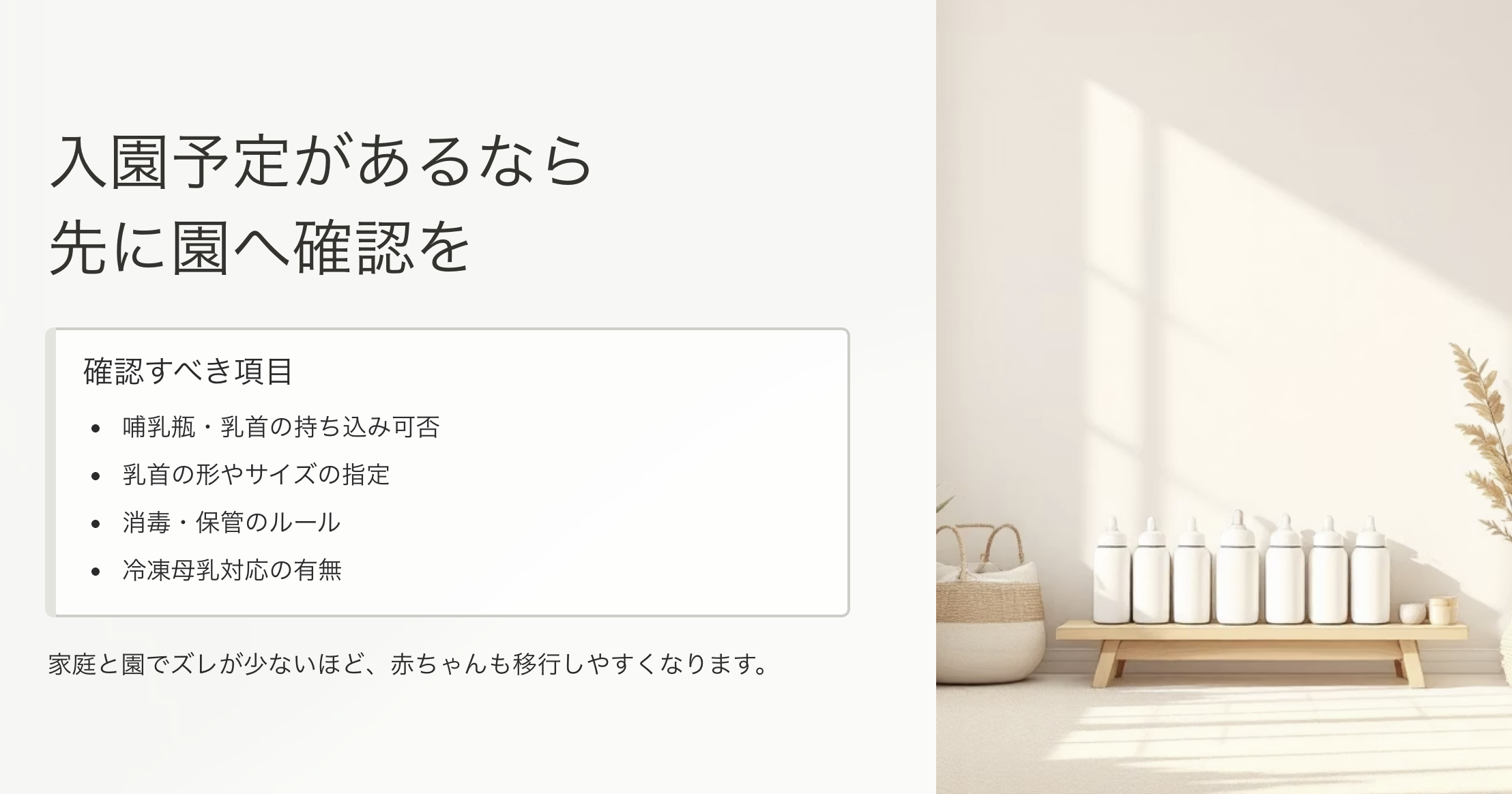 家庭と園で大きくズレがないほうが、赤ちゃんも移行しやすい。