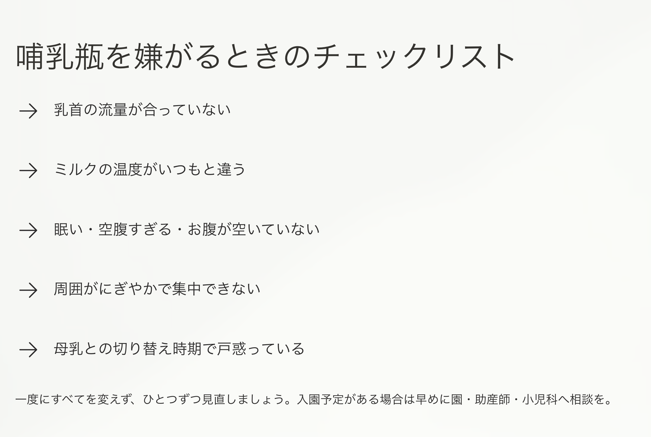 また、入園予定がある場合は、飲めない状態が長引く前に、早めに園や助産師、小児科へ相談しておくと安心です。