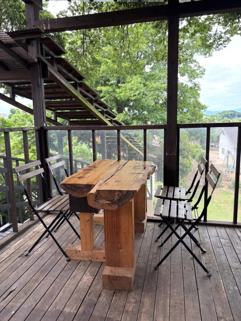 ツリーハウス2階のテラス席は椅子に子どもが立ってしまうとそのまま手すりにもよじ登れてしまうから目を離さないように気を付けてね!