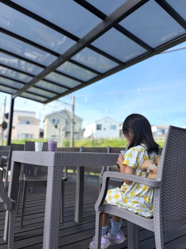 店内で子どもが泣き続けてしまうと、ママがちょっと気になっちゃうかもしれない。そんなときはテラス席に一度出ることもできるよ。