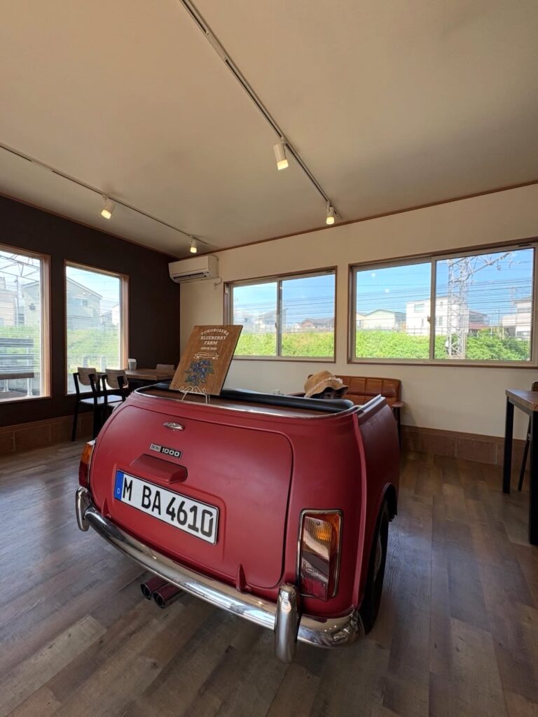 子どもが喜ぶブルーベリードリンク、入口と店内には半分になった可愛い赤い車がお出迎え。