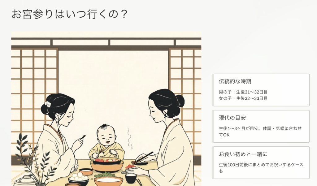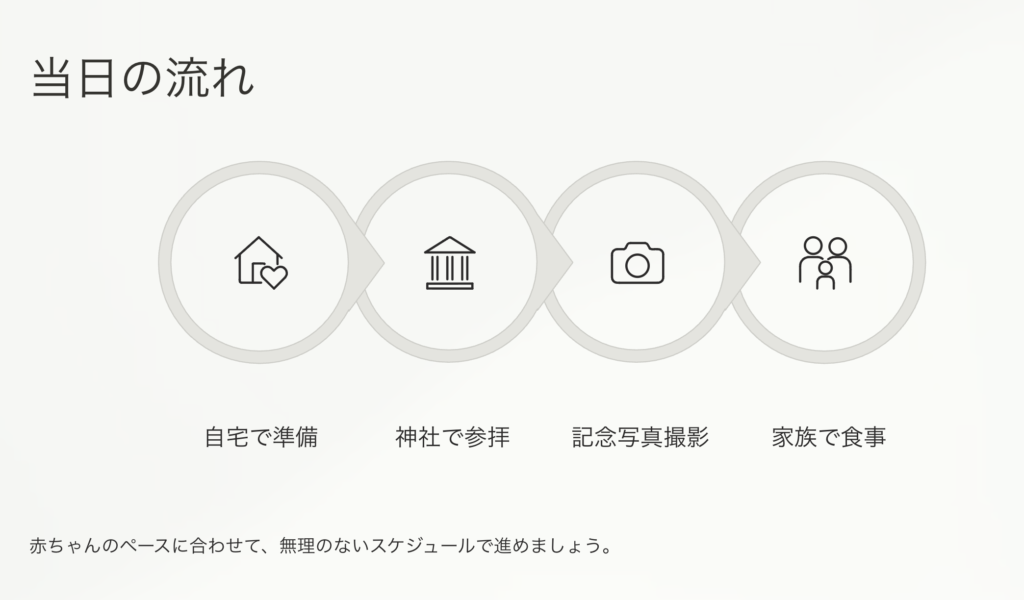 神社での参拝や家族との食事会など、あとから振り返ると特別な一日になることが多い行事です。