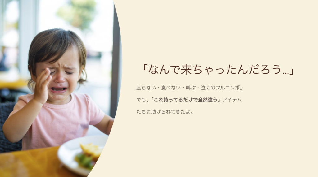 今日は、イヤイヤ期の外食時に、実際に使ってよかったアイテムをまとめてみたよ。