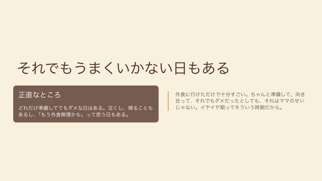 泣くし、帰ることもあるし、「もう外食無理かも」って思う日もある。 でもね、外食に行けただけで十分すごい。