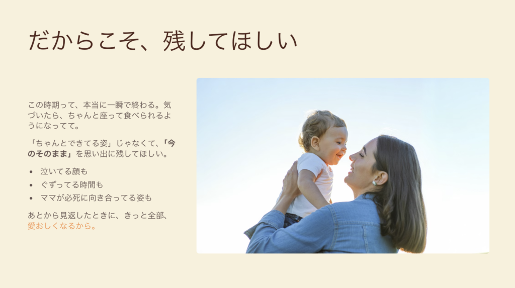 泣いてる顔も、ぐずってる時間も、ママが必死に向き合ってる姿も。