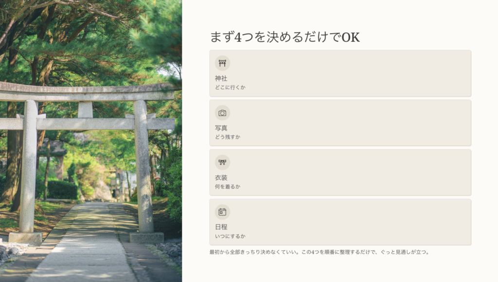 そう思って調べ始めたものの、神社・衣装・写真・着付け・食事会など、決めることが意外と多くて、途中で少し疲れてしまう方も多いのではないでしょうか。