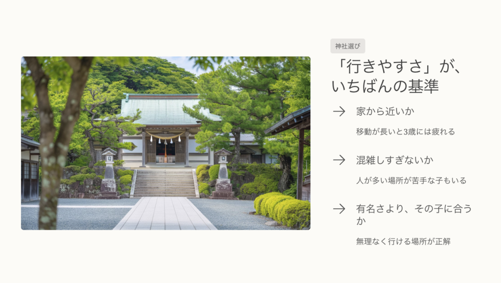 神社選びでは、有名かどうかよりも、その子にとって無理なく行けそうかを大切にすると、当日がぐっとラクになります。