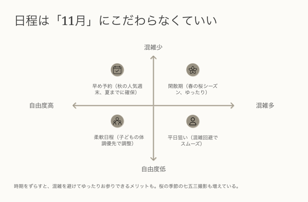 ただし、11月にこだわらなくても大丈夫です。気候が落ち着いている時期や、ご家族が動きやすい日程を選ぶ方も増えています。