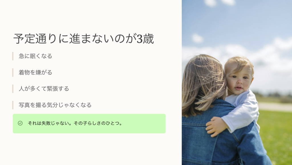 特に3歳は、まだ気分にむらがあったり、眠くなったり、着慣れない服を嫌がったりしやすい時期です。
