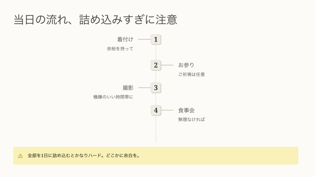 着付け、お参り、撮影、食事会を全部ぎゅっとまとめると、かなりハードになることもあります。