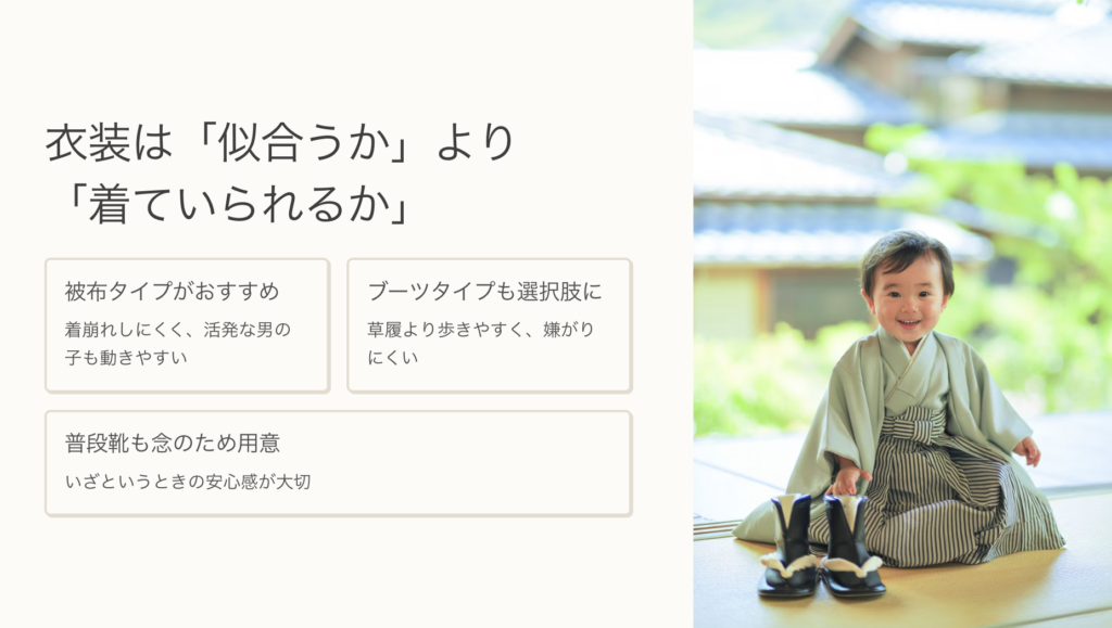 活発な男の子の場合は、被布タイプのほうが着崩れが目立ちにくく、動きやすさの面でもおすすめです。